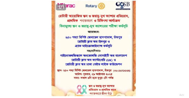বুধবার চাঁদপুর জেনারেল হাসপাতালে বিনামূল্যে স্তন ও জরায়ু-মুখ ক্যান্সার পরীক্ষা
