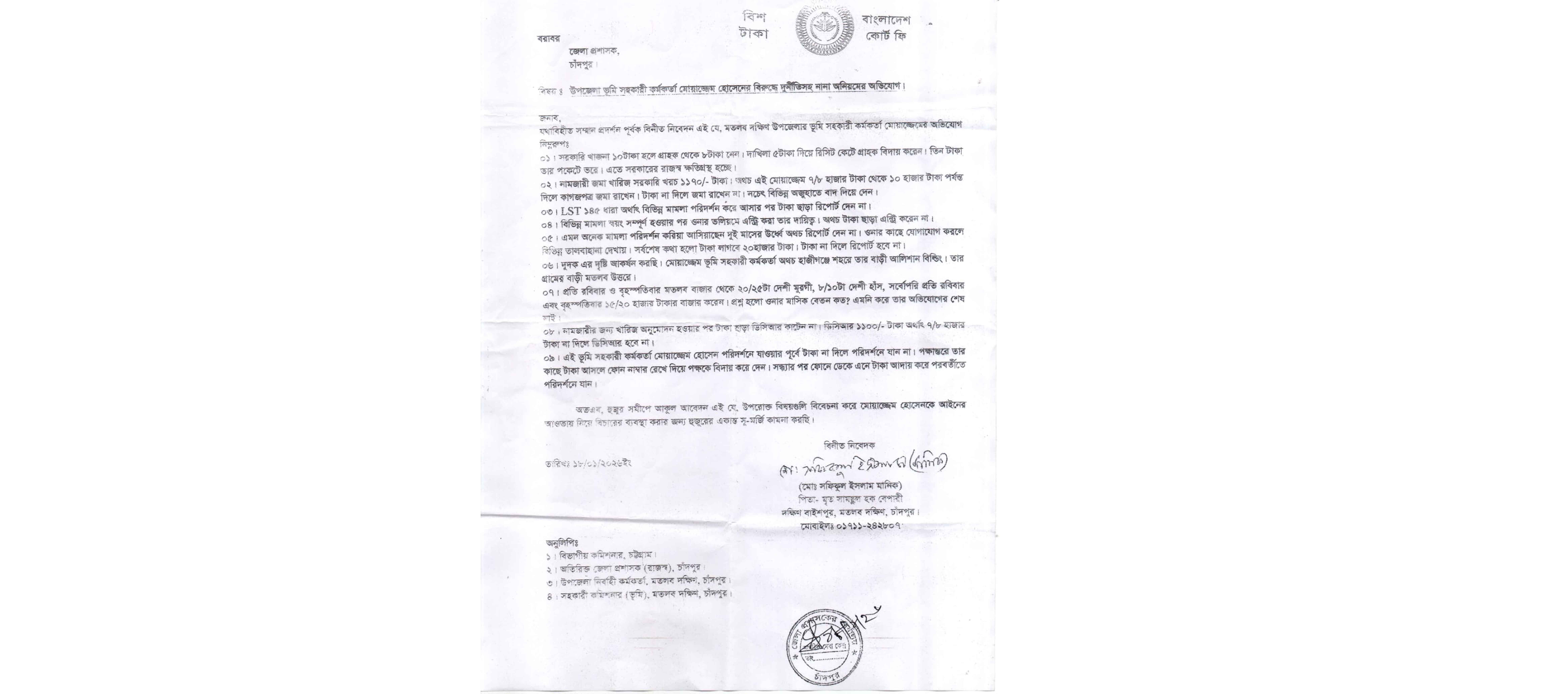 মতলবে উপজেলা ভূমি সহকারী কর্মকর্তার বিরুদ্ধে নানা অনিয়মের অভিযোগ