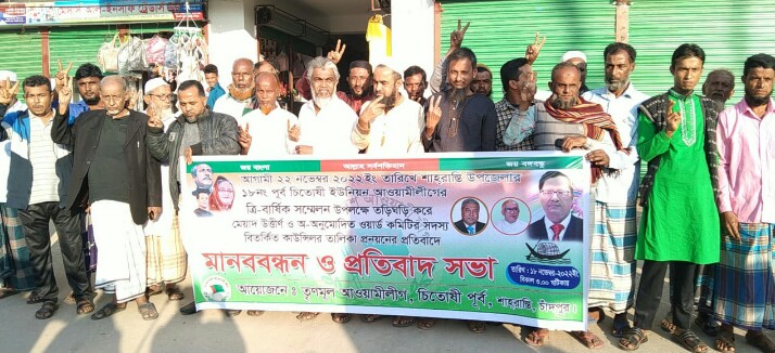 বিতর্কিত কাউন্সিলর তালিকা প্রণয়নের প্রতিবাদে চিতোষী পূর্ব ইউনিয়ন আওয়ামীলীগের মানববন্ধন