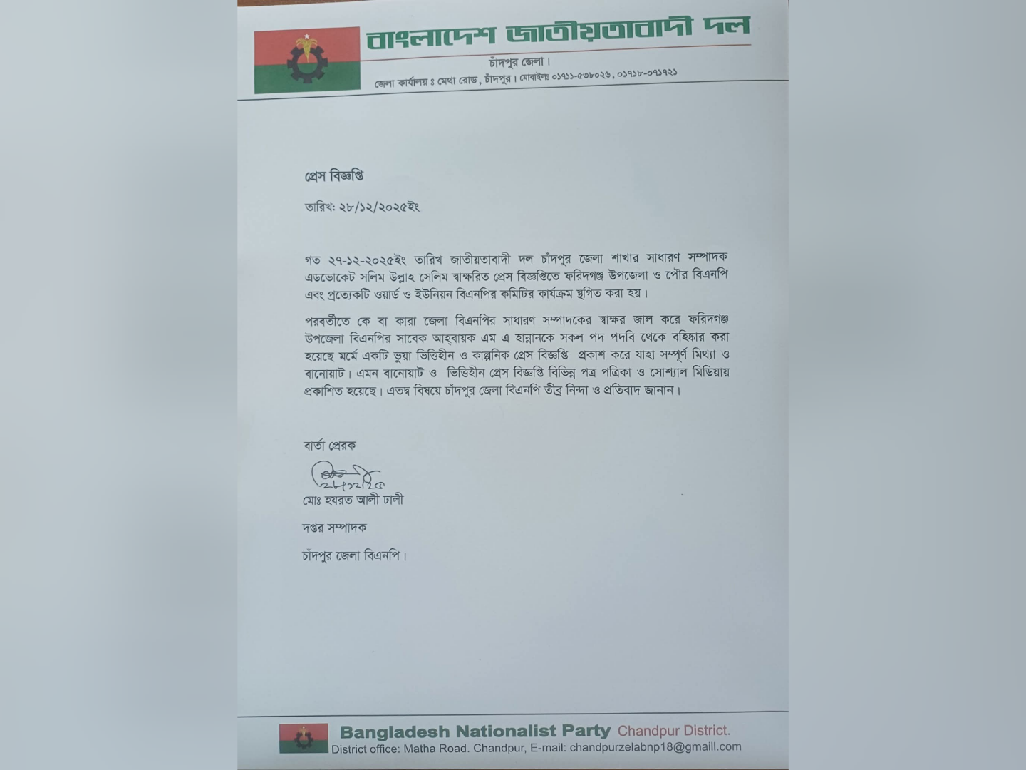 ফরিদগঞ্জে এমএ হান্নানকে সকল পদ-পদবি থেকে বহিষ্কারের ভুয়া প্রেস বিজ্ঞপ্তি প্রকাশ