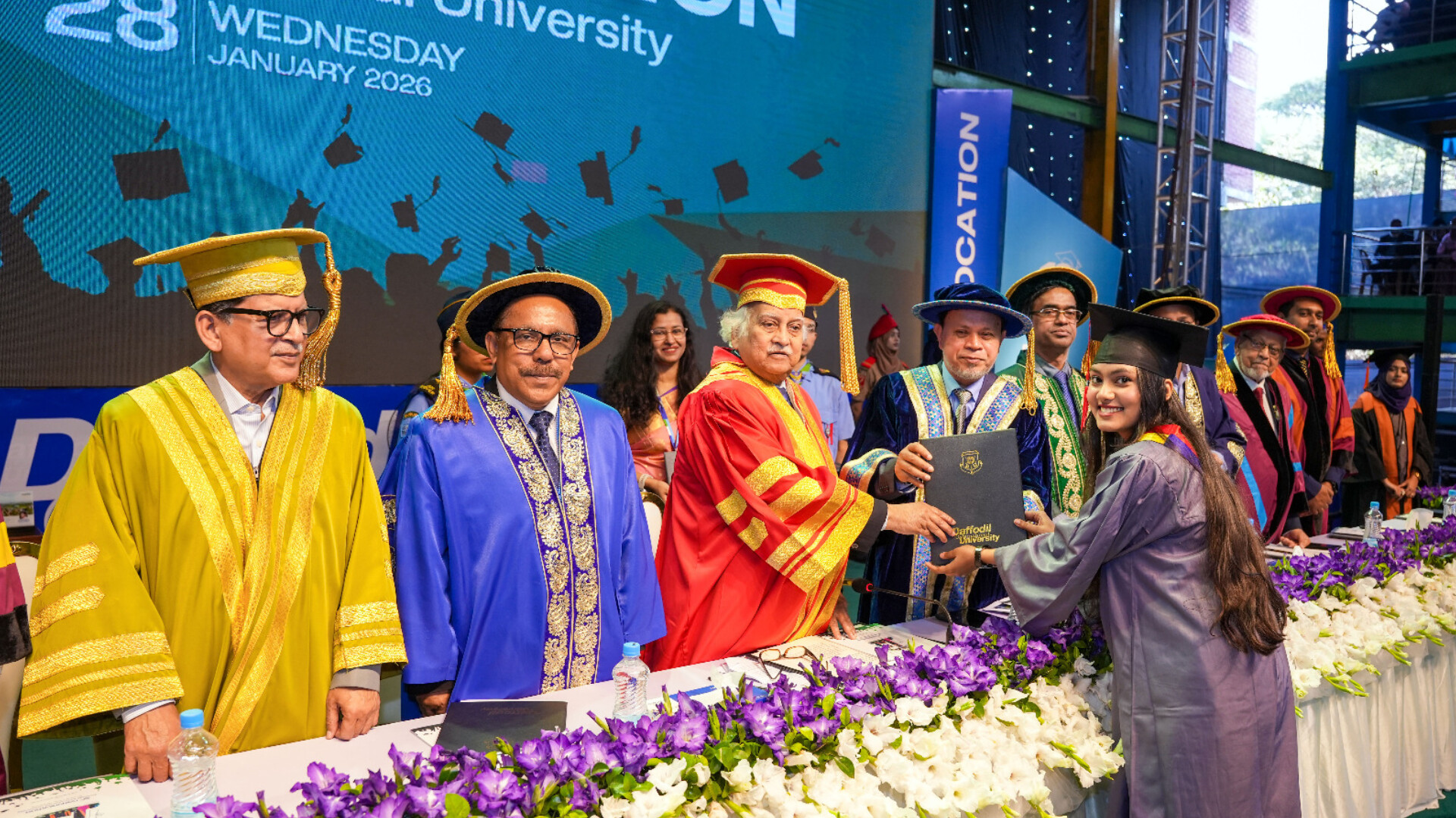 একই সঙ্গে তিনি দৃঢ়তার সাথে বলেন, “ড্যাফোডিল ইন্টারন্যাশনাল ইউনিভার্সিটি কখনোই তার গ্র্যাজুয়েটদের শুধু চাকরি প্রার্থী হিসেবে গড়ে তুলতে চায়নি। আমরা চাকরিদাতা হিসাব এ তৈরি করেছি। আজ আমাদের সবচেয়ে বড় শক্তি কোনো অবকাঠামো নয়, আমাদের গ্র্যাজুয়েটরা।”