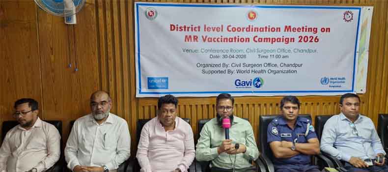বৃহস্পতিবার (৩০ এপ্রিল ২০২৬) সকালে চাঁদপুর সিভিল সার্জন অফিসের সম্মেলন কক্ষে আয়োজিত এ সভায় সভাপতিত্ব করেন সিভিল সার্জন ডা. মোহাম্মদ নূর আলম দীন। তিনি তাঁর বক্তব্যে বলেন, হাম ও রুবেলা প্রতিরোধে টিকা গ্রহণের কোনো বিকল্প নেই। সরকারের নির্দেশনা অনুযায়ী জেলার প্রতিটি উপজেলায় শতভাগ শিশুদকে টিকার আওতায় আনতে সংশ্লিষ্ট সকলকে সমন্বিতভাবে কাজ করতে হবে। এ ক্যাম্পেইন শুধু স্বাস্থ্য বিভাগের নয়, এটি একটি সামাজিক আন্দোলন।