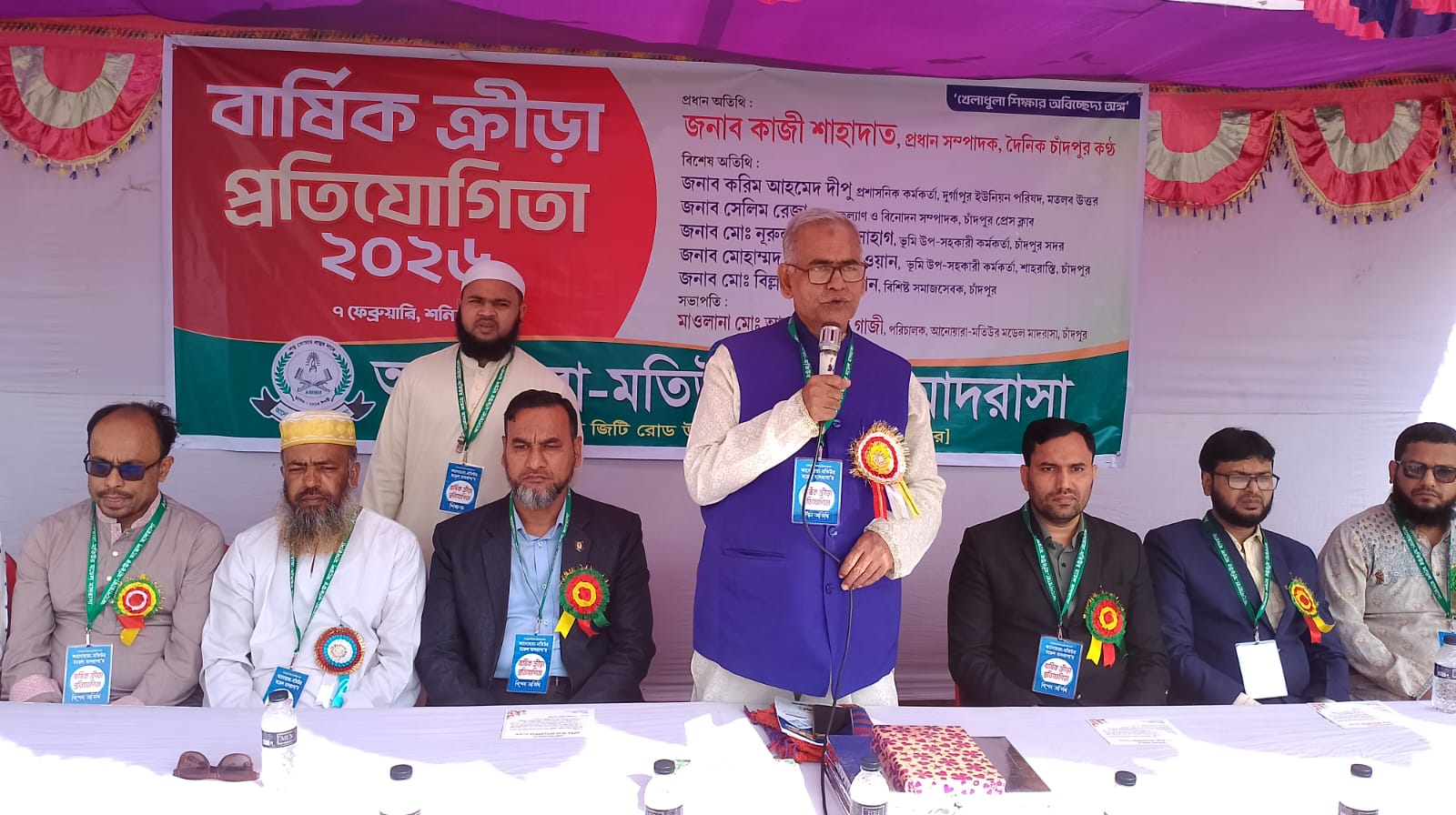 চাঁদপুর পৌরসভার ১৫নং ওয়ার্ডের বিষ্ণুদী জিটি রোড উত্তর এলাকায় আনোয়ারা-মতিউর মডেল মাদরাসার বার্ষিক ক্রীড়া প্রতিযোগিতার উদ্বোধন করা হয়েছে। শনিবার (৭ ফেব্রুয়ারি ২০২৬) সকালে মাদ্রাসার নিকটস্থ মাঠে দিনব্যাপী এ ক্রীড়া প্রতিযোগিতার শুভ উদ্বোধন করেন দৈনিক চাঁদপুর কণ্ঠের প্রধান সম্পাদক কাজী শাহাদাত। তিনি তাঁর বক্তব্যে বলেন, ক্রীড়া প্রতিযোগিতা শিক্ষার্থীদের পড়ালেখার একটি অংশ। এটি বছরে একবার আনুষ্ঠানিকভাবে হয়ে থাকে। কিন্তু সারা বছর ক্রীড়াচর্চা হলে এর মাধ্যমে তৃণমূল থেকে