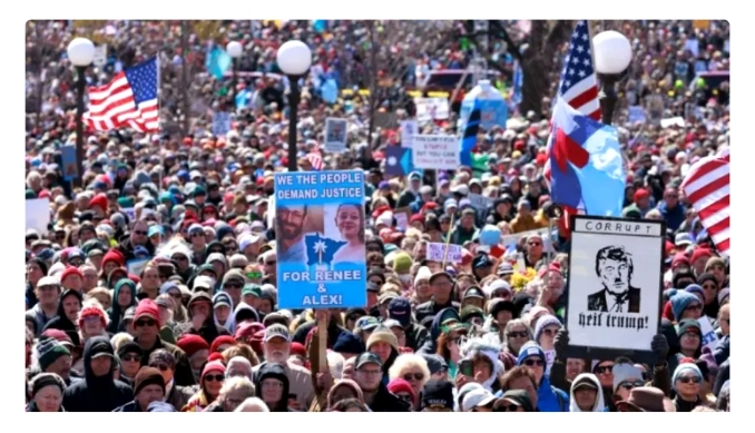 ওয়াশিংটন ডিসি ও মিনিয়াপোলিস | ঠিক এক মাস আগে শুরু হওয়া ইরান যুদ্ধের প্রতিবাদ এবং অভ্যন্তরীণ ‘দমনপীড়নের’ বিরুদ্ধে একাট্টা হয়েছে মার্কিন জনতা। শনিবার যুক্তরাষ্ট্রের ৫০টি অঙ্গরাজ্যের ৩,৩০০-এরও বেশি স্থানে ‘নো কিংস’ আন্দোলনের তৃতীয় দফার কর্মসূচিতে লাখ লাখ মানুষ অংশ নিয়েছেন। বিক্ষোভকারীদের স্পষ্ট বার্তা— “আমেরিকা কোনো রাজার শাসনে চলবে না।”