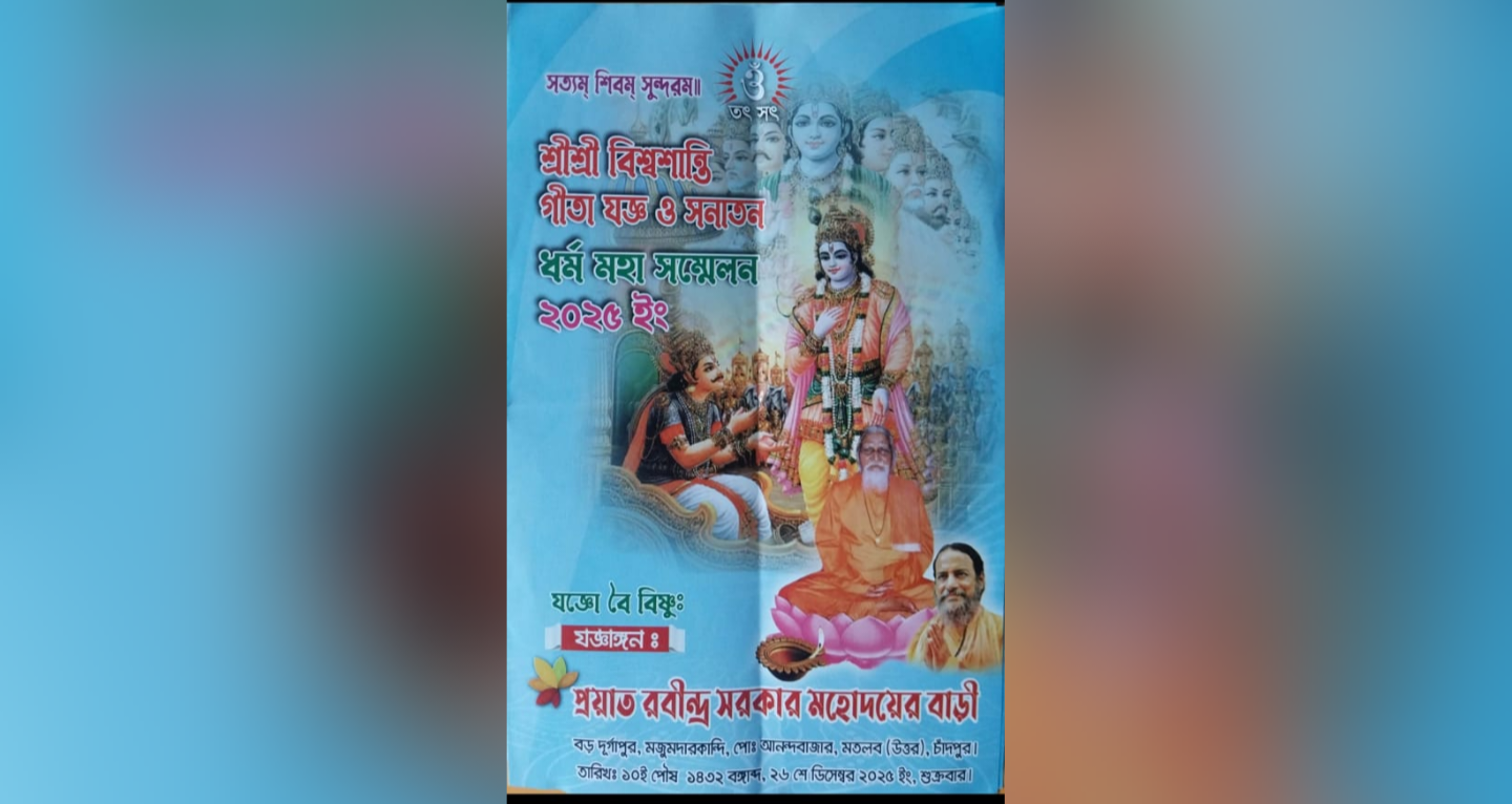 মতলব বড় দুর্গাপুরে বিশ্বশান্তি গীতাযজ্ঞ ও সনাতন ধর্ম মহাসম্মেলন ২৬ ডিসেম্বর