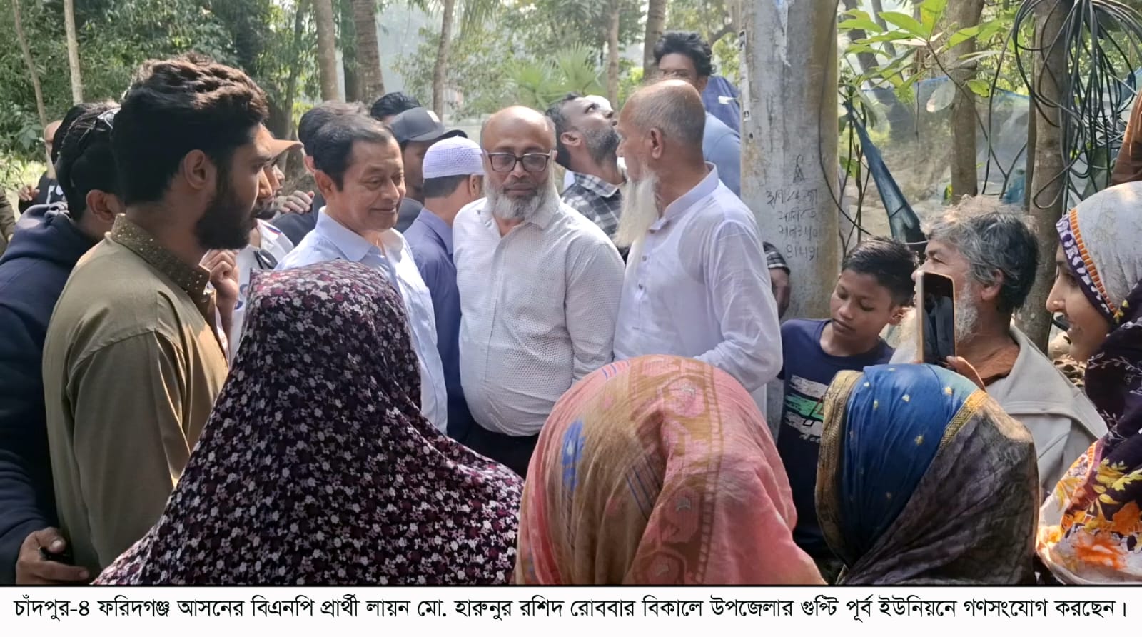চাঁদপুর-৪ (ফরিদগঞ্জ) আসনে বাংলাদেশ জাতীয়তাবাদী দল-বিএনপি মনোনীত প্রার্থী বিএনপির জাতীয় নির্বাহী কমিটির ব্যাংকিং ও রাজস্ব বিষয়ক সম্পাদক লায়ন মো. হারুনুর রশিদ রোববার (২৫ জানুয়ারি ২০২৬) উপজেলার গুপ্টি পূর্ব ইউনিয়নের ত্রিদোনা, দত্রা, গুপ্টি গ্রামের বিভিন্ন বাড়ি বাড়ি গিয়ে গণসংযোগ করেছেন। গণসংযোগকালে তিনি বলেন, নানা ঘাত প্রতিঘাতের মধ্যেও বিএনপি এক মিনিটের জন্যেও রাজপথ ছাড়েনি। কারণ বিএনপি জনগণের দল। তাই দল হিসেবে বিএনপি জনগণের জন্যে কাজ করতে বদ্ধপরিকর। কারণ বিএনপি শহীদ জিয়ার দল, বেগম খালেদা জিয়ার দল, তারেক রহমানের দল। যাদের কাছে এদেশের মানুষের বাইরে কোনো কিছুই নেই। আগামী নির্বাচনকে ঘিরে আমাদের নেতা বিএনপির চেয়ারম্যান তারেক রহমান তাঁর ভবিষ্যৎ পরিকল্পনা ব্যক্ত করেছেন। যা ৩১ দফার মাধ্যমে ইতোমধ্যেই আপনারা জেনেছেন। এর বাইরেও আরো অনেক কিছুই রয়েছে। আপনাদের ভোটের মাধ্যমে ফরিদগঞ্জসহ সারাদেশে বিএনপির বিজয়ে দল রাষ্ট্র ক্ষমতা পরিচালনার দায়িত্ব পেলে তার প্রতিফলন দেখবেন। আরেকটি গুরুত্বপূর্ণ কথা আপনাদের মনে রাখতে হবে, আমাদের দল বিএনপি, তার প্রতীক ধানের শীষ। এর বাইরে কোনো মার্কা নেই। যারা ইতোমধ্যেই মাঠে অন্য প্রতীক নিয়ে নিজেদেরকে বিএনপি দাবি করে ভোট চাইছেন, তাদের বিষয়ে সাবধান থাকবেন। ধানের শীষের বাইরে কোনো কথা নেই। আমি ব্যক্তি হারুন নয়, আপনাদের চিন্তা করতে হবে এই প্রতীক শহীদ জিয়ার, বেগম খালেদা জিয়ার, তারেক রহমানের।